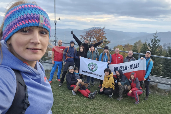 Po niespełna godzinie wszyscy dotarliśmy do punktu widokowego obok schroniska, gdzie – zgodnie z tradycją – zrobiliśmy grupowe zdjęcie z panoramą Beskidu Śląskiego w tle. Ekipa dopisała liczebnie, więc część uczestników zabrała się za organizację ogniska, a reszta z zapałem im kibicowała. Chwila moment – i ognisko było gotowe! Smakowaliśmy kiełbaski i domowe przysmaki przyniesione z domów, a rozmowom i śmiechom nie było końca.