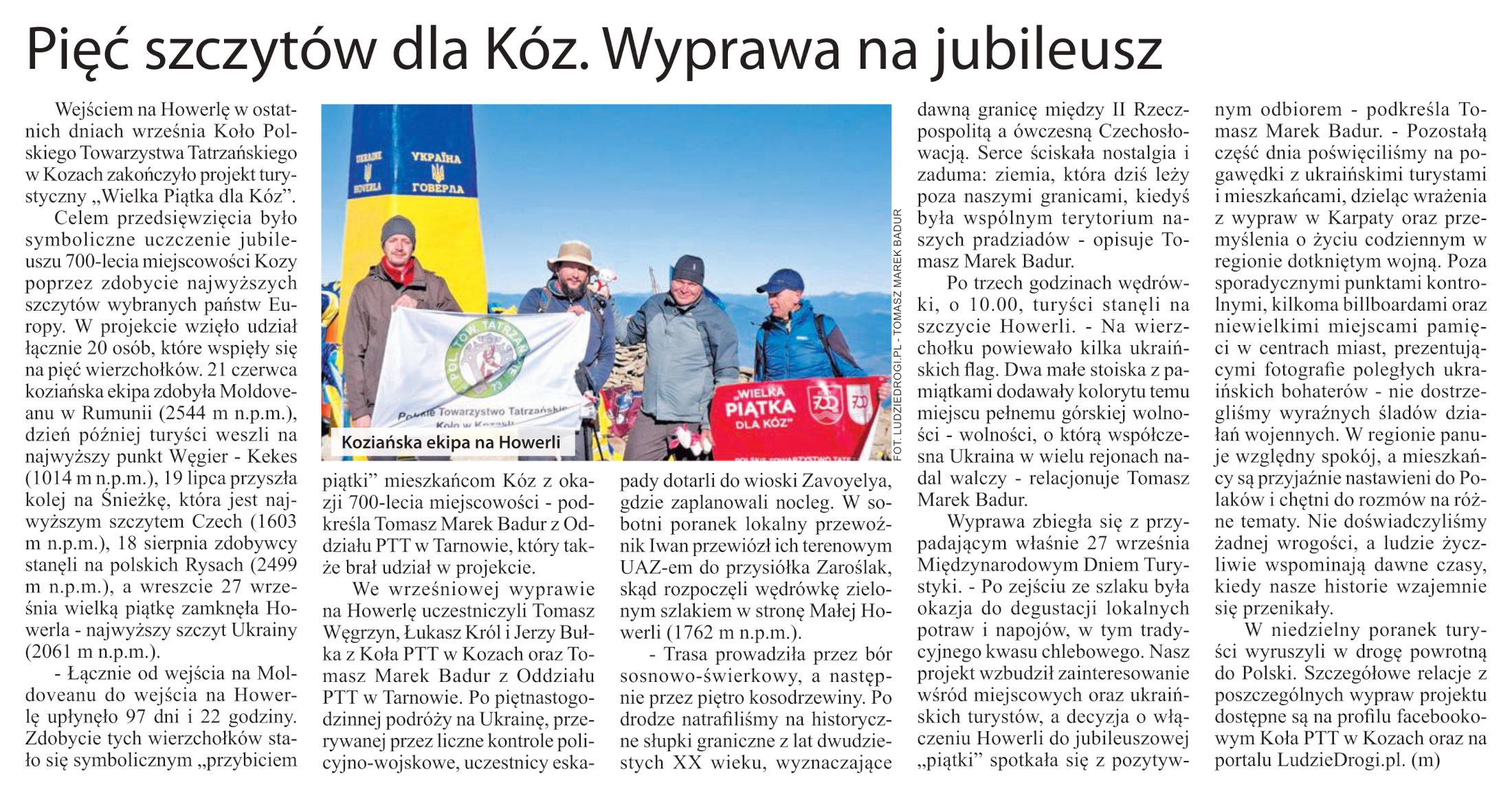 W dzisiejszej „Kronice Beskidzkiej” (nr 41 (3582) / 2025) na stronie 17 ukazał się artykuł Magdaleny Nycz pt. „Pięć szczytów dla Kóz. Wyprawa na jubileusz” o niedawno zakończonej akcji „Wielka piątka dla Kóz”. Przypominamy, że w tym roku nasi koledzy z Koła PTT w Kozach weszli na najwyższe szczyty Rumunii, Węgier, Polski i Czech, a w końcówce września zakończyli projekt zdobyciem Howerli (2061 m), najwyższej góry na Ukrainie.