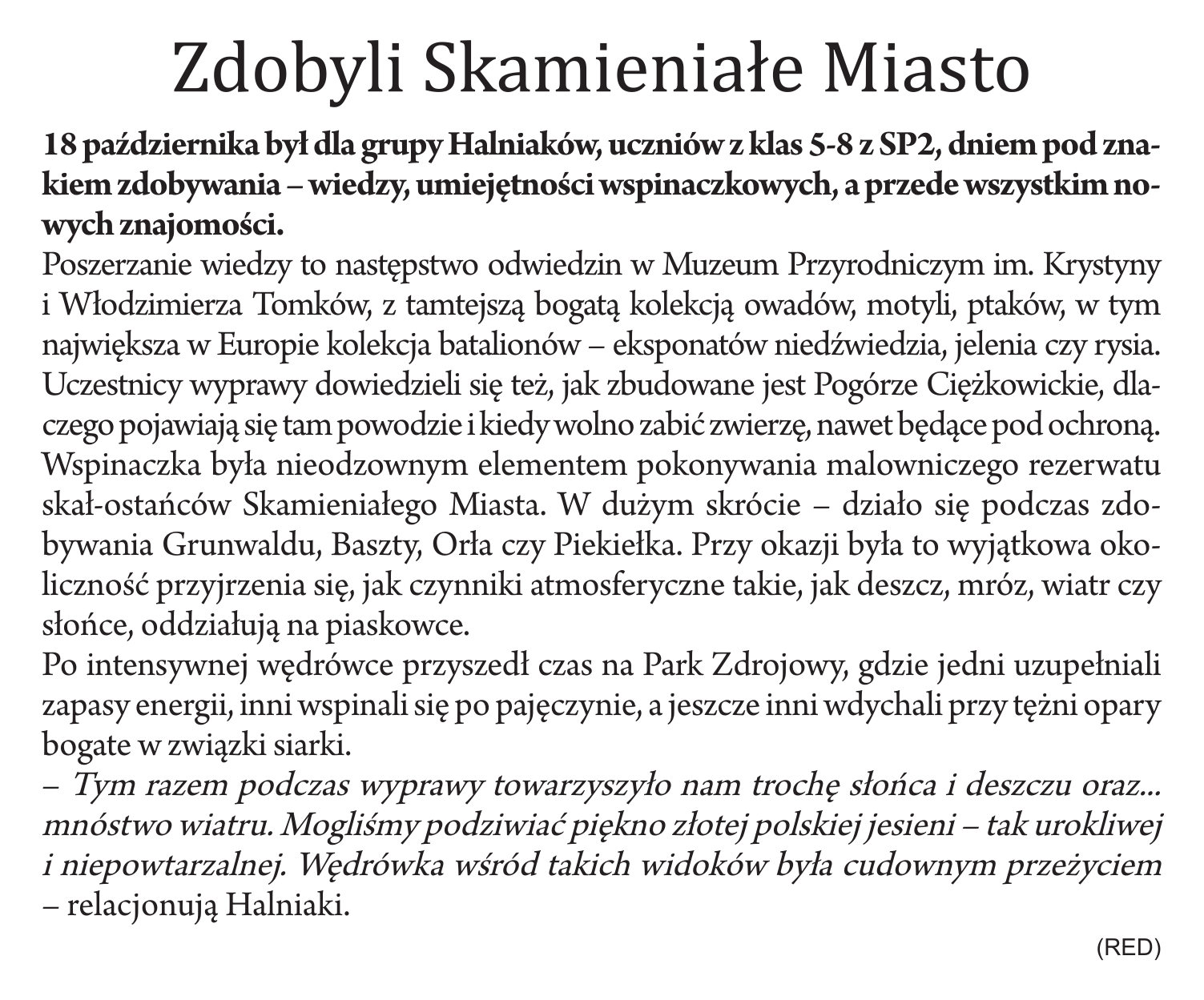 Na stronie 7 najnowszego numeru „Koziańskich Wiadomości” (11/2025), czasopisma wydawanego przez Urząd Gminy Kozy, ukazał się artykuł pt. „Zdobyli Skamieniałe Miasto” na temat wycieczki SK PTT „Halniaki” ze Szkoły Podstawowej nr 2 w Kozach, której celem było Skamieniałe Miasto na Pogórzu Ciężkowickim i nie tylko…
