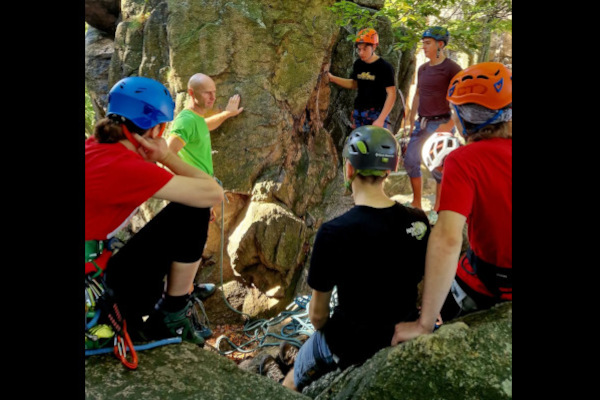 uczestnicy obozu wspinaczkowego słuchają rad Roberta