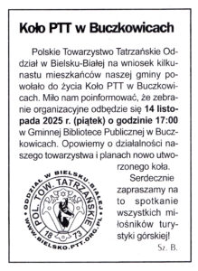 W najnowszym numerze „Gazety Gminnej” (5 (160) / 2025) – pisma samorządowego Gminy Buczkowice na stronach 5 ukazało się zaproszenie do udziału w zebraniu organizacyjnym niedawno utworzonego Koła PTT w Buczkowicach, które odbędzie się 14 listopada 2025 r. o godz. 17:00 w Gminnej Bibliotece Publicznej w Buczkowicach.