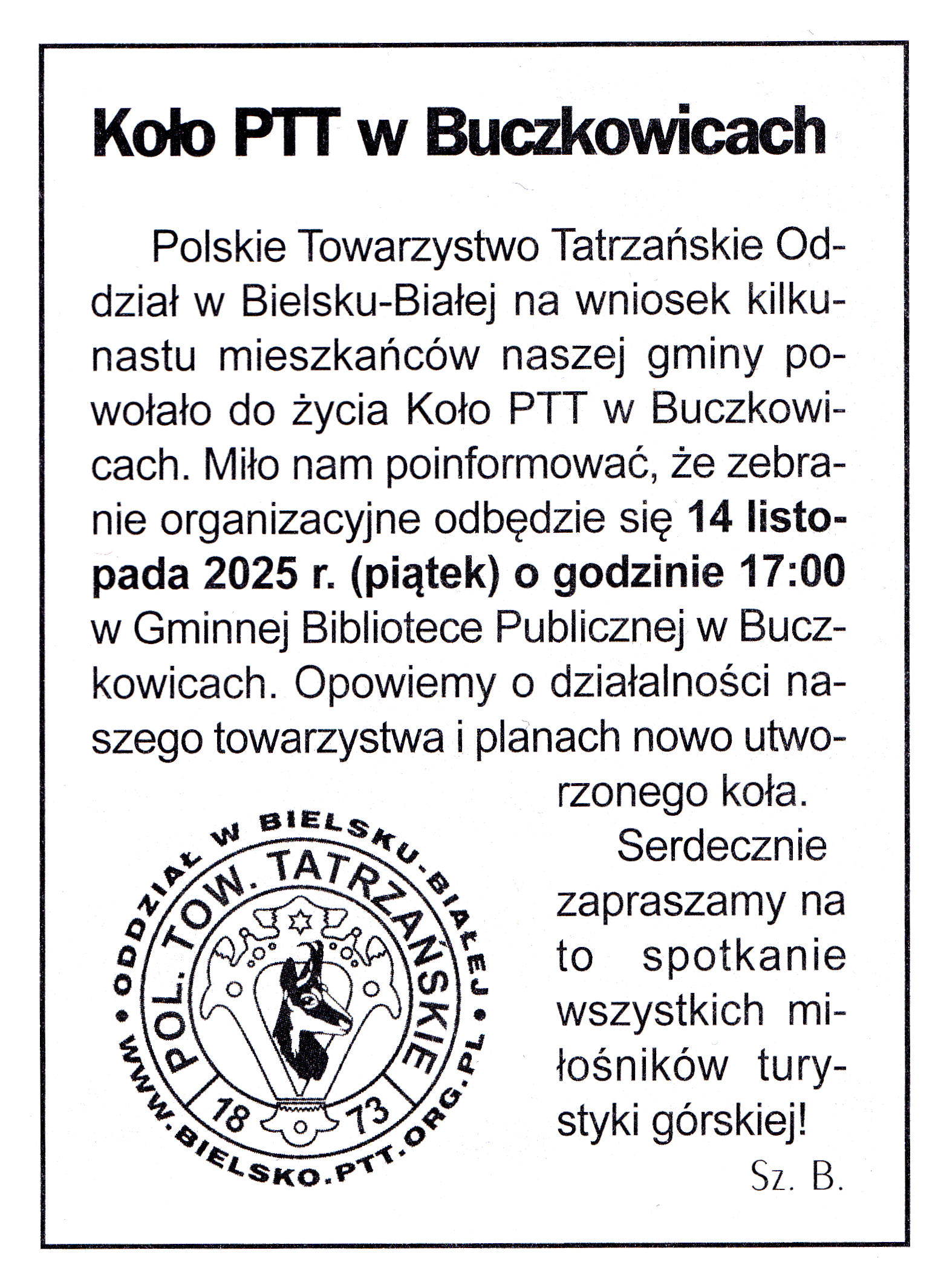 W najnowszym numerze „Gazety Gminnej” (5 (160) / 2025) – pisma samorządowego Gminy Buczkowice na stronach 5 ukazało się zaproszenie do udziału w zebraniu organizacyjnym niedawno utworzonego Koła PTT w Buczkowicach, które odbędzie się 14 listopada 2025 r. o godz. 17:00 w Gminnej Bibliotece Publicznej w Buczkowicach.